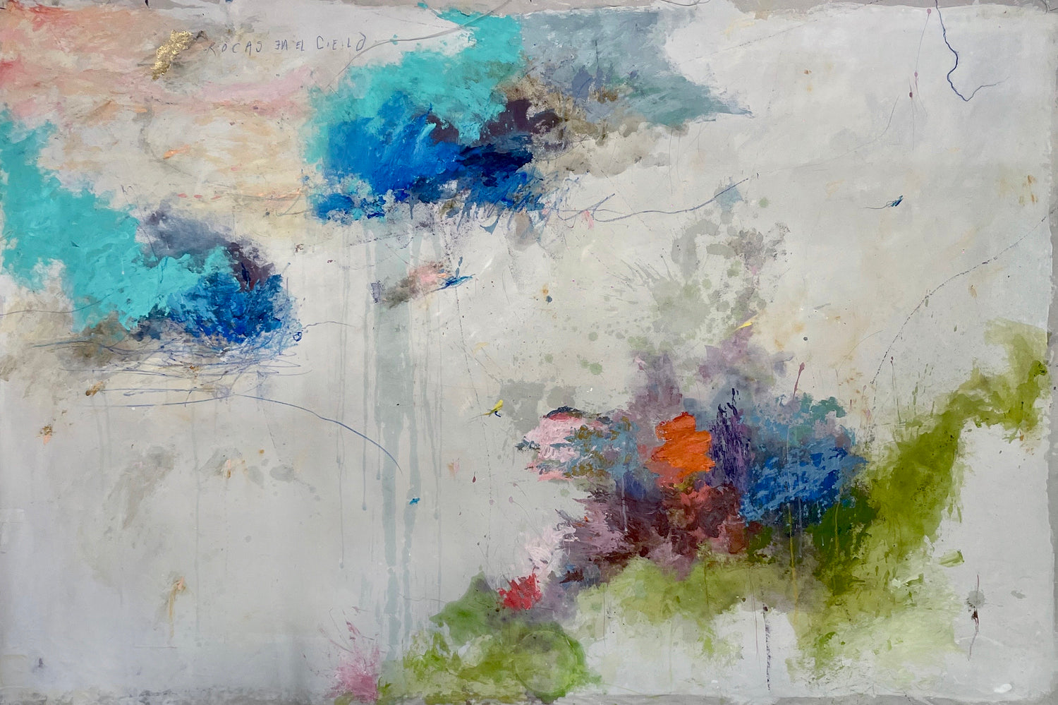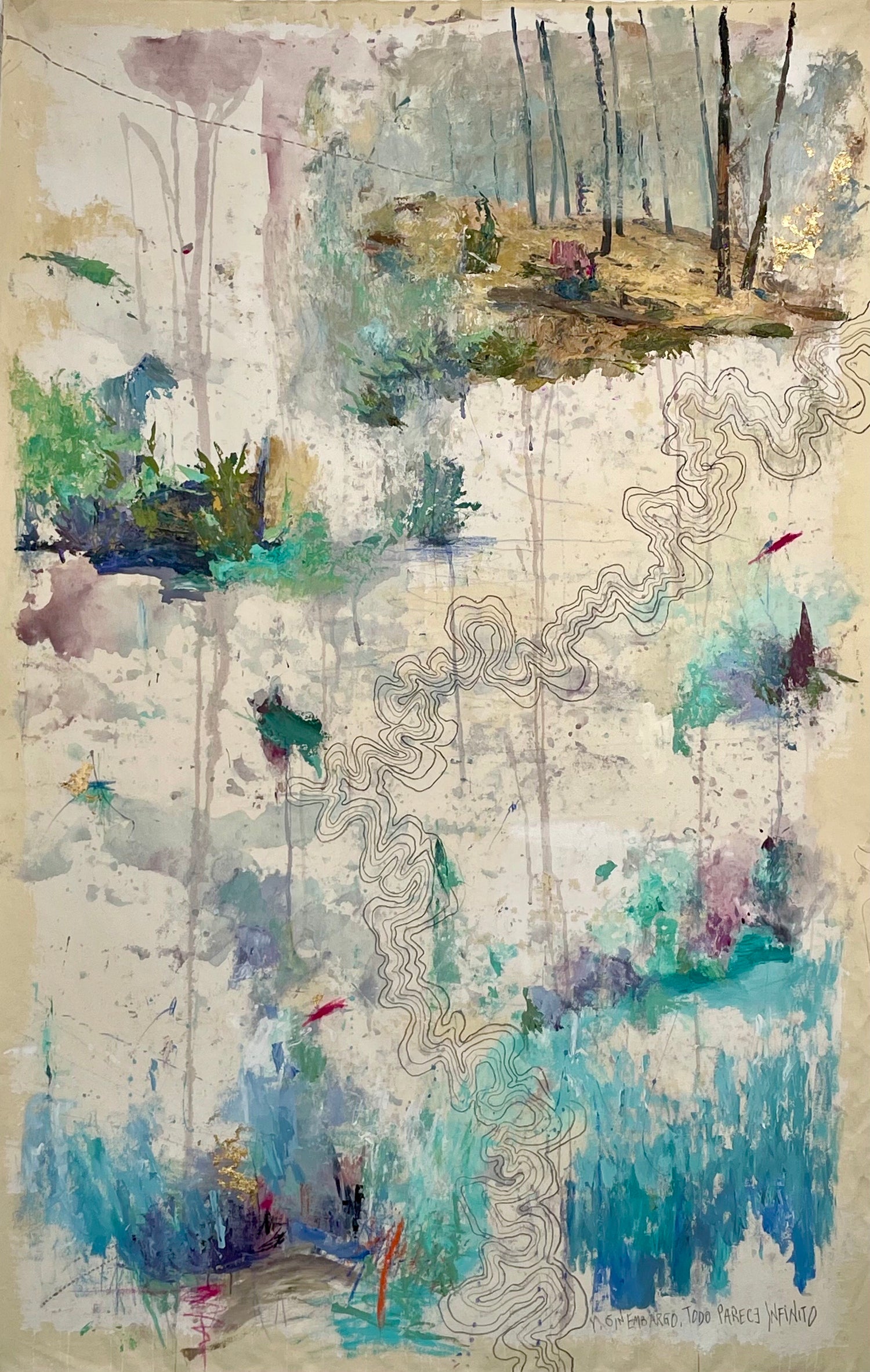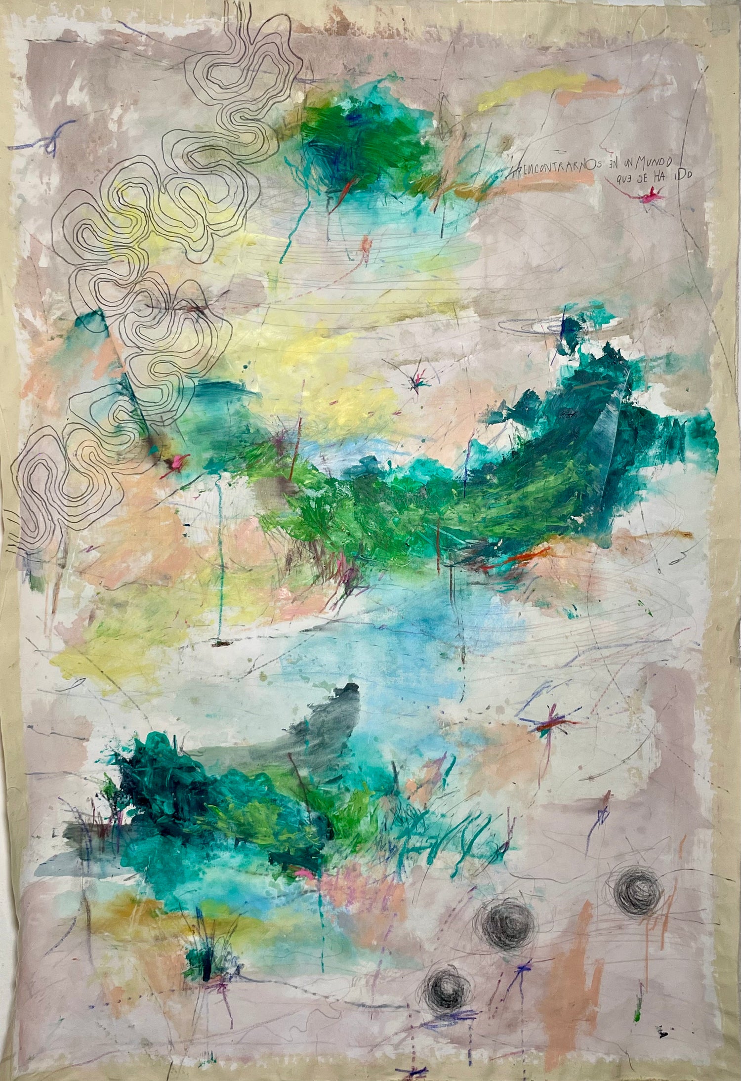 acrílico,grafito,pasteles y carboncillo sobre tela aún sin estirar de 180 x 200 cm aprox. 2023